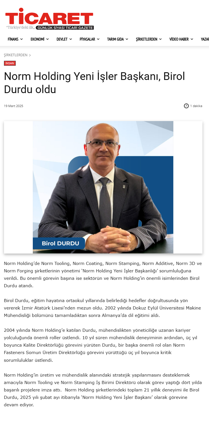 Norm Holding Yeni İşler Başkanı, Birol Durdu oldu